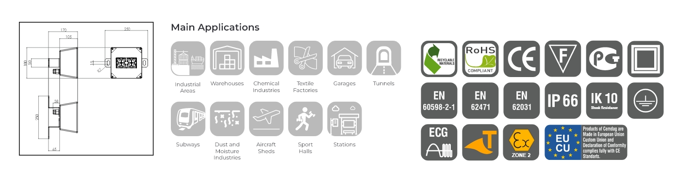 | Huvudreferens Företagets riktlinjer | EN 60598-1, EN 60598-2-7, EN 62471, EN 60068-2-11, EN60068-2-52, 1SO9227, ASTM B117, ASTM D3359-78, ıso 4628-2, ıso 4628-4, EN 60529, EN 62262, ANSIC136.10-2017, ANSIC136.2-2018, EN 62031, 1 EC 62384, ASTMD3359, EN ıso 2409, IES LM 80-15, IES LM 82-12, IES LM 84-14, IES LM 85-14, IES TM 21-11, CE, RoHS, 1SO9001, 1SO14001, 1SO18001, 1SO5001, 1SO45001, 1SO39001, EAC, TURKAK |