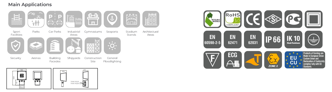 | Huvudreferens Företagets riktlinjer | EN 60598-1, EN 60598-2-5, EN 62471, EN 60068-2-11, EN60068-2-52, 1509227, ASTM B117, ASTM D3359-78, 150 4628-2, 150 4628-4, EN 60529, EN 62262, AN51C136.10-2017, AN51 C136.2-2018, EN 62031, IEC 62384, ASTM D3359, EN 150 2409, IE5 LM 80-15, IE5 LM 82-12, IE5 LM 84,14, IE5 LM 85-14, IE5TM 21-11, 1509001, 15014001, 15018001, 1505001, TURKAK |