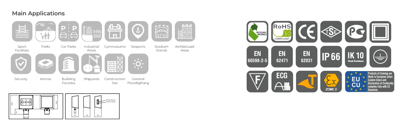 | Huvudreferens Företagets riktlinjer | EN 60598-1, EN 60598-2-5, EN 62471, EN 60068-2-11, EN60068-2-52, 1509227, ASTM B117, ASTM D3359-78, 150 4628-2, 150 4628-4, EN 60529, EN 62262, AN51C136.10-2017, AN51 C136.2-2018, EN 62031, IEC 62384, ASTM D3359, EN 150 2409, IE5 LM 80-15, IE5 LM 82-12, IE5 LM 84,14, IE5 LM 85-14, IE5TM 21-11, 1509001, 15014001, 15018001, 1505001, TURKAK |