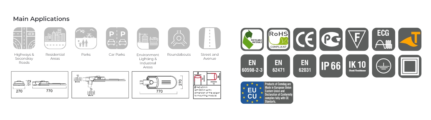 EN fiZ117, EN 62722-1, EN 62722-2-1, EN 60596-1, EN 60596-2-3, EN 62471, EN 60068-2-TI, EN60068-2-52, IS092Z7,A51MBTI7,A51MD3359-78, 1504628-2, 150 4628-4, EN f,()529, EN 62262,ANSI036.10-20l7, ANSI036.2-2018, EN 62031, IEC 62384,A51MD3359, EN 1502409, IES LM 80-15,IES lM 82-12, IES LM 84-14, IES LM 85-14, LM 79-19, IESlM 21-TI, CE, RoHS, 1S0900I, 1S01400I, ISOlBOOI, ISOSOOI, 1504500I, IS039001, EAC, TIJRKAK