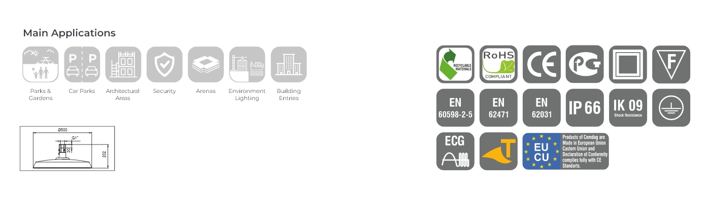 | Huvudreferens Företagets riktlinjer | EN 60598-1, EN 60598-2-1, EN 62471, EN 60068-2-11, EN60068-2-52, ISO9227, ASTMB117, ASTMD3359-78, ISO 4628-2, ISO 4628-4, EN 60529, EN 62262, ANSIC136.10-2017, ANSIC136.2-2018, EN 62031, IEC 62384, ASTMD3359, EN ISO 2409, IES LM 80-15, IES LM 82-12, IES LM 84-14, IES LM 85-14, IES TM 21-11, CE, RoHS, ISO9001, ISO14001, ISO18001, ISO5001, ISO45001, ISO39001, EAC |