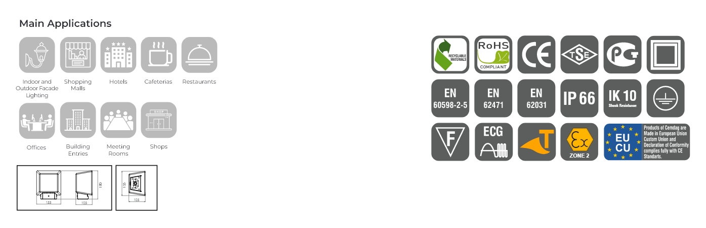 ANSIC136.10-2017, ANSIC136.2-2018, EN 62031, 1 EC 62384, ASTMD3359, EN ıso 2409, IES LM 80-15, IES LM 82-12, IES LM 84-14, IES LM 85-14, IES TM 21-11, CE, RoHS, 1SO9001, 1SO14001, 1SO18001, 1SO5001, 1SO45001, 1SO39001, EAC, TURKAK